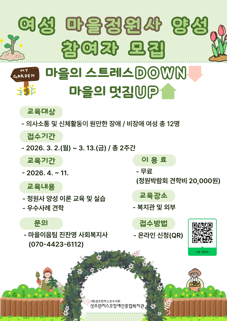 ◆ 접수기간: 2026. 3. 2.(월) ~ 3. 13.(금) ◆ 접수방법: 온라인(QR코드 또는 접수링크) 및 전화 신청 ※ 접수링크: https://m.site.naver.com/1ZKyS ◆ 결과발표: 2026. 3. 25.(수) ※ 홈페이지 게시 및 신청자 개별 연락 ◆ 교육기간: 2026. 4. ~ 11.(수) ◆ 교육대상: 정원 디자인(신체활동)과 식물해설(의사소통)이 원만한 여성 장애인 / 비장애인 총 12명 ◆ 교육내용: 마을정원사 양성 이론 교육 및 실습, 우수사례 견학, 평가회 등 ◆ 이 용 료: 무료(우수사례 견학비 20,000원) ◆ 신청문의: 성프란치스꼬장애인종합복지관 마을이음팀 진찬영 사회복지사 (070-4423-6112 / 010-9532-6211) 많은 관심 부탁 드립니다~~^^*