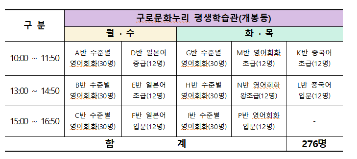 2026 구로월드카페 톡톡 강의 일정 및 수강 신청 안내 □ 수강 안내 - 상반기 (3월 3일~ 6월 29일) - 하반기 (8월 31일 ~ 12월 24일) ※ 일정은 변경될 수 있음. 7~8월 휴강 □ 상반기 수강 신청 안내 ○ 신청 기간 : 2026. 2. 2.(월) ~ 2. 20. (금) - 2. 2. (월) 9:00 ~ : A, B, C 수준별 영어회화 신청(월수반) - 2. 3. (화) 9:00 ~ : D, E, F 일본어 중급/초급/입문 신청 - 2. 4. (수) 9:00 ~ : G, H, I 수준별 영어회화 신청(화목반) - 2. 5. (목) 9:00 ~ : M, N, P 영어회화 초급/왕초급/입문 신청 - 2. 6. (금) 9:00 ~ : K, L 중국어 초급/입문 신청 ※ 날짜 별로 신청반이 다르니 잘 확인해 주세요. □ 수강료 : 60,000원 □ 시간표