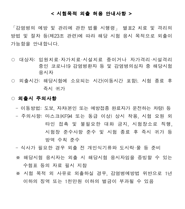 | 코로나19 확진자 격리대상자 시험목적 외출허용 안내(국민건강보험공단 신규직원채용) | |
