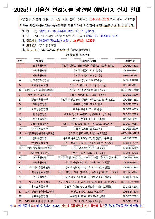 공지사항 홈 보건민원 공지사항 전자점자뷰어보기(새창 열림) 전자점자파일다운로드 인쇄 공유하기 공유하기 페이스북 X 블로그 닫기 조회수 322 작성일 2025년 10월 02일 10시 28분 06초 보건소-보건민원-공지사항 상세보기 - , 제목, 내용, 파일, 조회수, 작성일의 정보를 제공합니다. 2025년 가을철 반려동물 광견병 예방접종 실시 안내 파일 jpg 파일 포스터 시안.jpg 파일다운로드 미리보기/음성듣기 hwp 파일 안내문 (2025년 가을철 반려동물 광견병 예방접종).hwp 파일다운로드 미리보기/음성듣기 목록 이전글 야생동물 광견병 미끼예방약 살포 안내문 다음글 감염병 매개곤충 방역교육(우리집에 왜 왔니?쥐바퀴벌레퇴치대작전) 신청안내