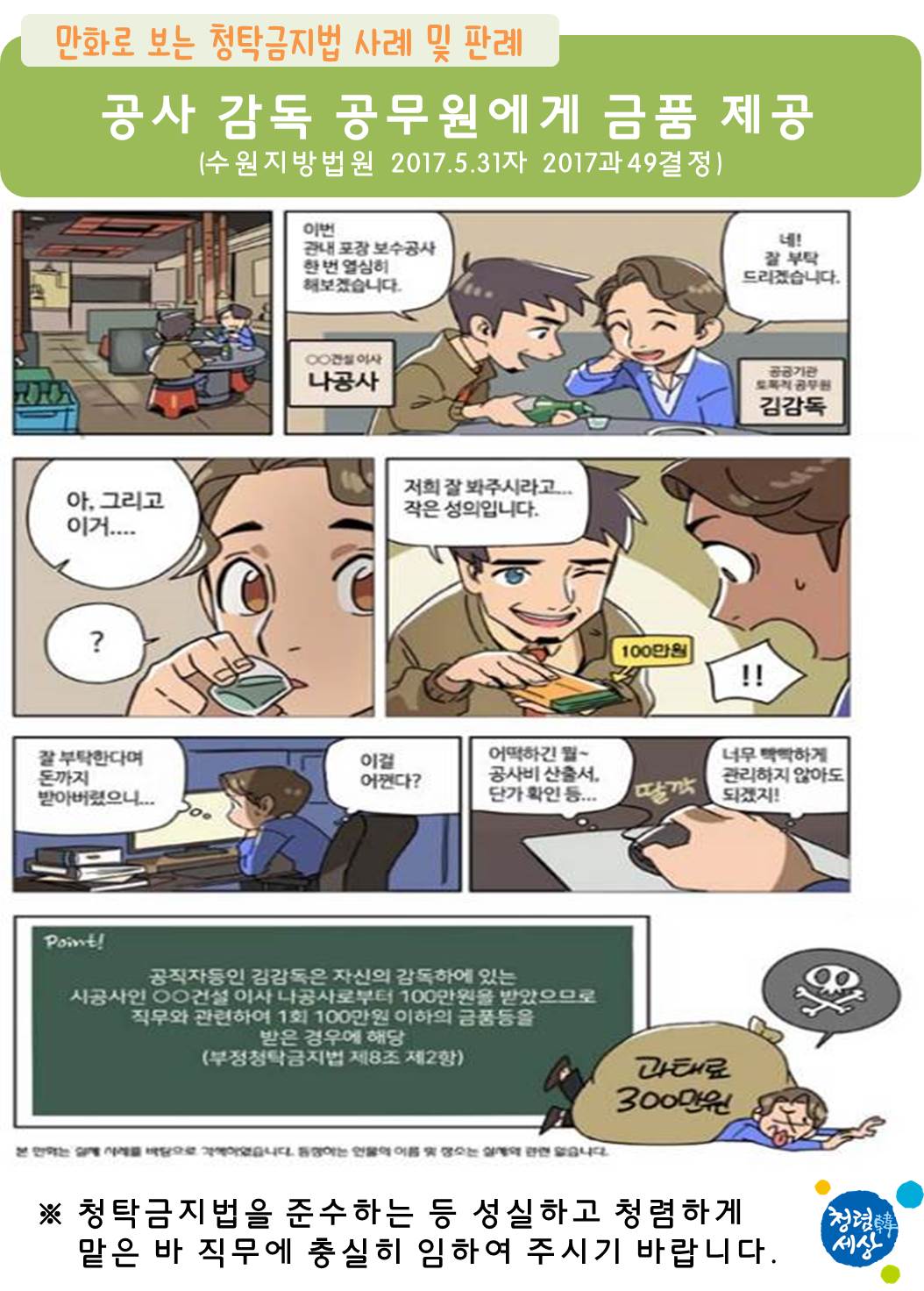 청렴관련 교육자료 홈 청렴 자료실 청렴관련 교육자료 인쇄 공유하기 공유하기 페이스북 X 블로그 닫기 조회수 4300 작성일 2020년 04월 17일 10시 15분 42초 청렴인권-청렴 자료실-청렴관련 교육자료 상세보기 - , 제목, 내용, 파일, 작성자, 조회수, 작성일의 정보를 제공합니다. 만화로 보는 청탁금지법 사례 및 판례 목록 이전글 외부강의 등 신고규정 안내 다음글 (청탁금지법) 이선물 받아도 되나?
