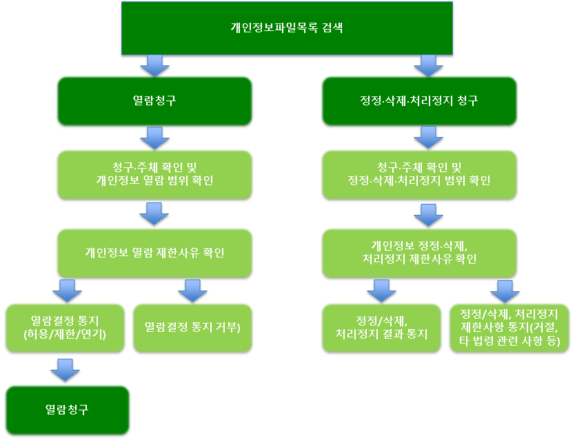 - 2개인정보 열람, 정정·삭제, 처리정지 등 요구는 서면, 전화, 전자우편, 인터넷 등을 통해 개인정보 수집창구 또는 개인정보파일 관리 부서로 신청하실 수 있습니다.