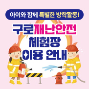 구로구는 아이들이 화재·지진·태풍·응급처치 등 다양한 재난 상황을 직접 체험하며 대응 방법을 배울 수 있는 ‘구로재난안전체험장’을 운영하고 있습니다. 아이들이 놀면서 안전을 배우는 특별한 시간을 구로재난안전체험장에서 보내보시기 바랍니다.