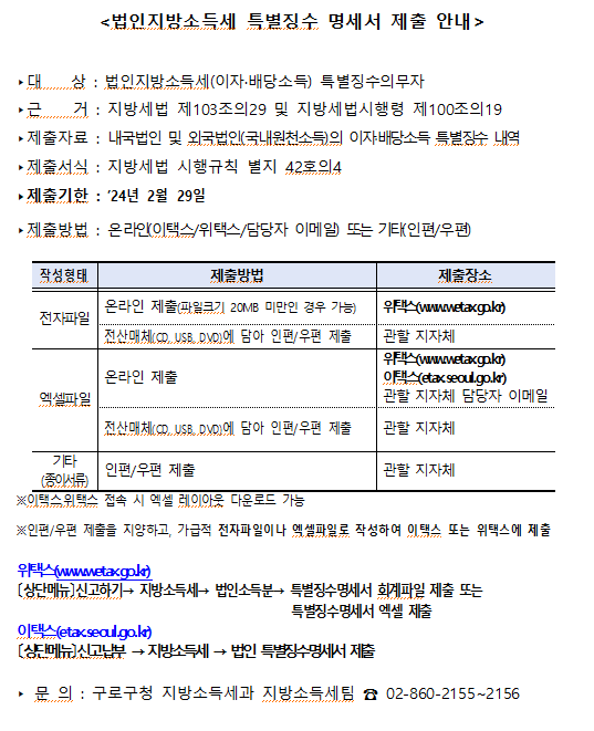 | 2023년 귀속 법인의 이자 배당소득 특별징수명세서 제출 안내 | |