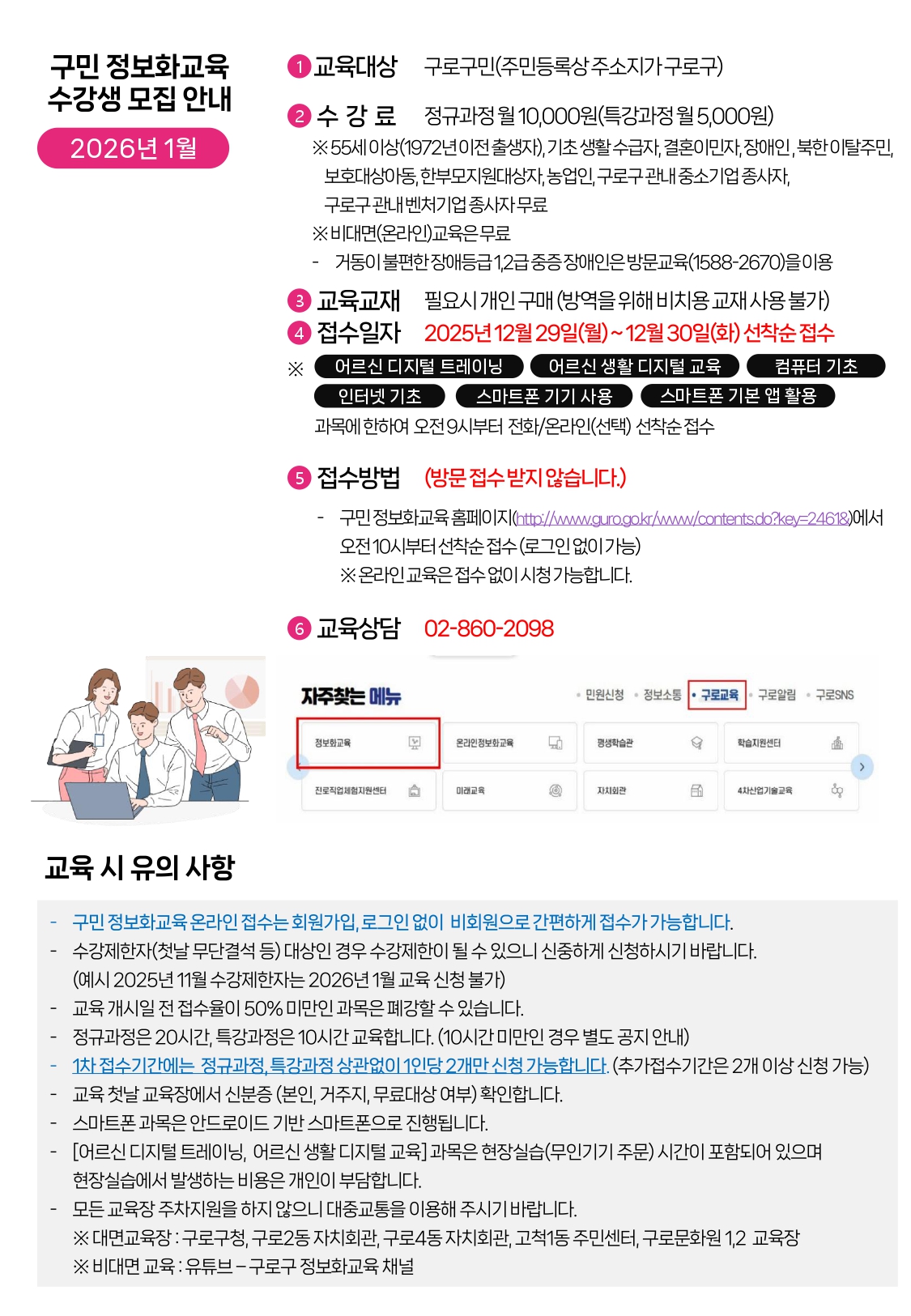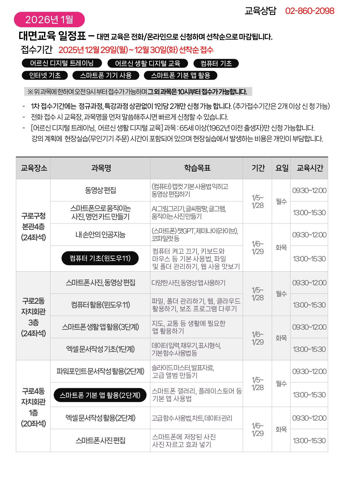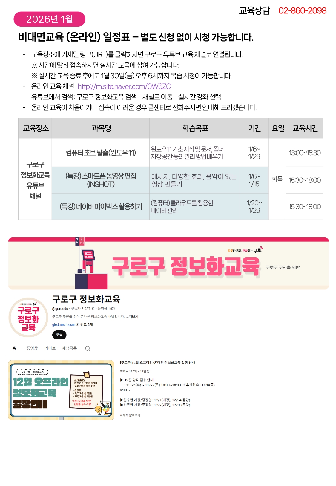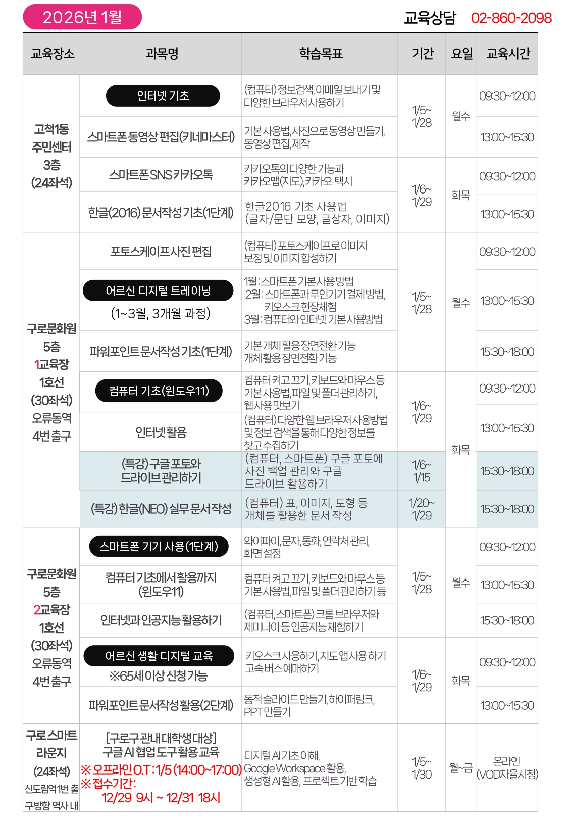 2026년 1월 구민 정보화교육을 대면·비대면 교육 병행으로 운영하여 구로구 구민들에게 지속적인 정보화교육 기회를 제공하고자 합니다.