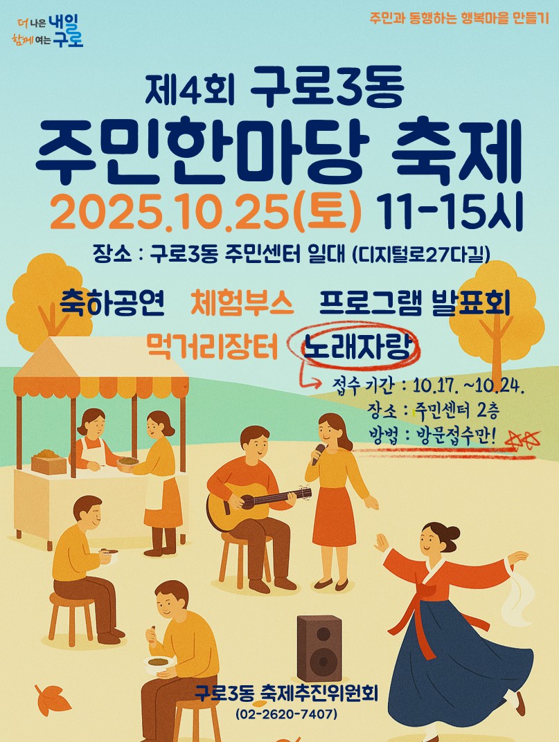 | 제4회 구로3동 주민한마당 축제 및 노래자랑 모집 안내 | |