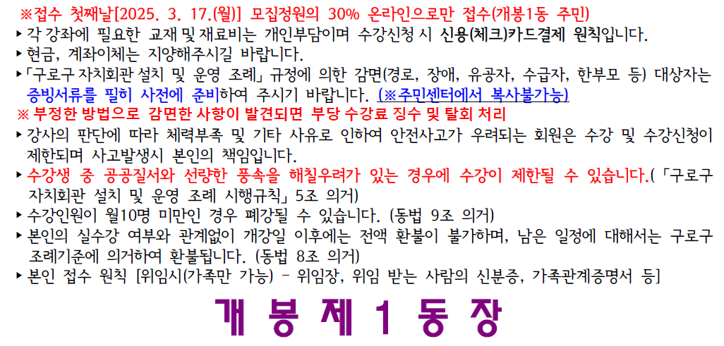 자치회관 프로그램 2025.2분기 수강생모집 안내 ❍ 접수기간 : 2025. 3. 17.(월) ~ 모집인원 접수완료시까지 ※ 3. 17.(월) 9시 ~ 18시 ☞ 온라인 접수만 시행 (개봉1동 주민) ※ 온라인 접수 방법 : 구로구청 홈페이지≫구로교육≫자치회관≫개봉1동 자치회관에서 신청 ※ 3. 18.(화) 8시 30분부터 개봉1동 주민 우선 접수, 신분증 지참 필수 ※ 3. 19.(수) 8시 30분부터 ☞ 타동 포함 접수 ❍ 접수장소 : 개봉1동 주민센터 ❍ 수강기간 : 3개월(2025. 4. 1. ~ 2025. 6. 30.) ※문의 : ☎02-2620-7176 자치 회관