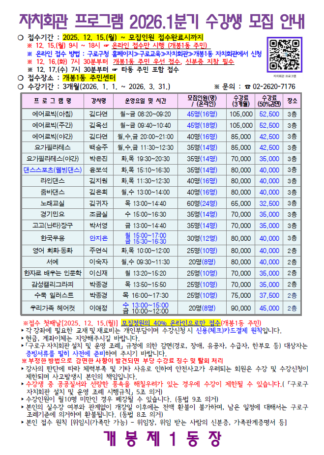 | 2026년 1분기 개봉1동 자치회관 프로그램 수강생 모집 안내 | |