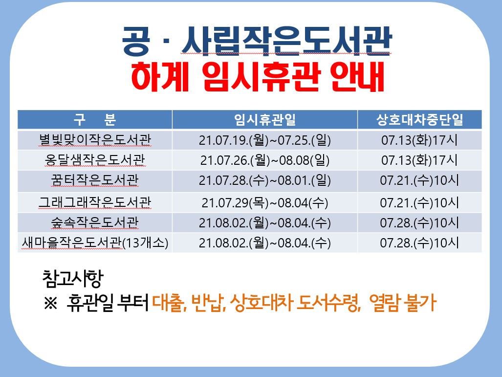 * 임시휴관일 : 2021.08.02.(월) ~ 08.04.(수) * 지혜의 등대 상호대차 중단 : 07.28.(수) 10시부터