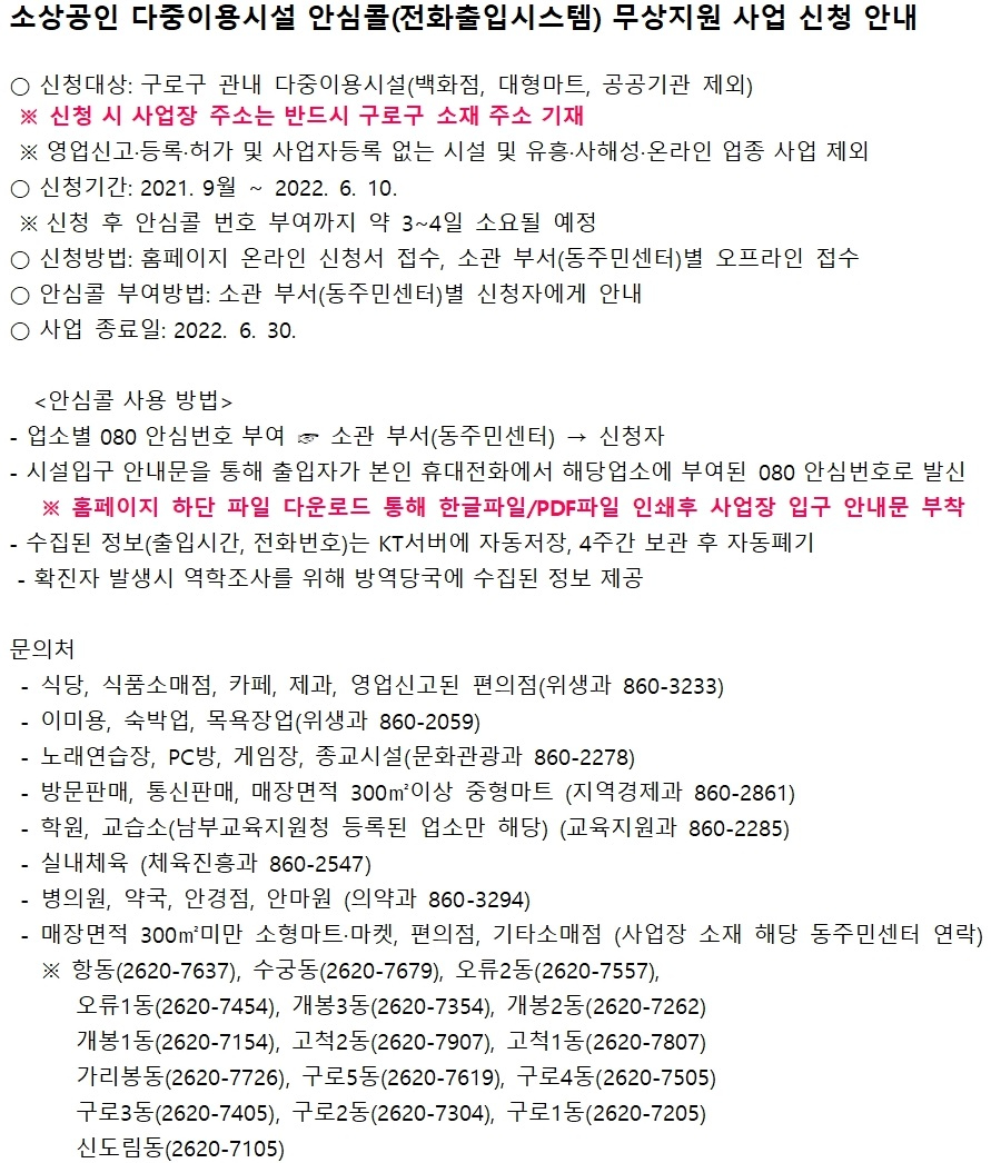 - 안심콜(전화출입시스템) 지원신청에 필요한 주소, 성명, 연락처, 생년월일, 상호명 등 개인정보를 개인정보보호법 제15조1항1호 및 제24조1항1호에 의거 구로구청에 제공