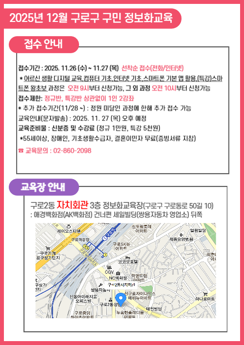 구로2동 정보화 교육장(3층) 08280 서울특별시 구로구 구로동로50길 10 3층 정보화교육장 |