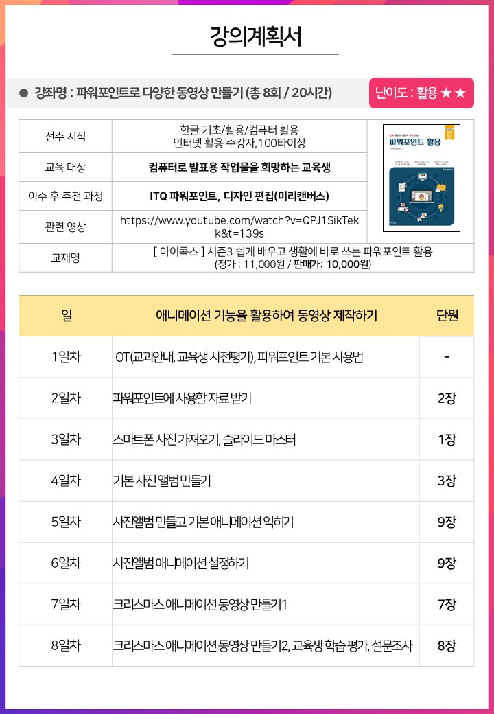 | 파워포인트로 다양한 동영상 만들기 신청자:21/24명 , 대기자:0/12명 | |||