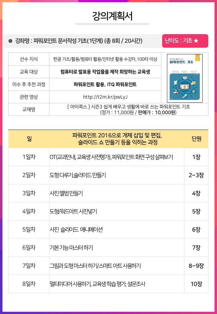 | 파워포인트 문서작성 기초(1단계) 신청자:20/20명 , 대기자:4/10명 | |||