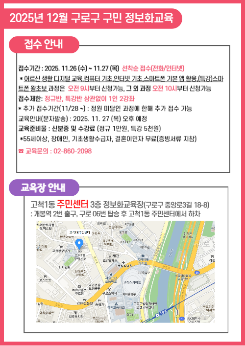 고척1동 정보화교육장(3층) 08225 서울특별시 구로구 중앙로3길 18-8 3층 정보화교육장 |