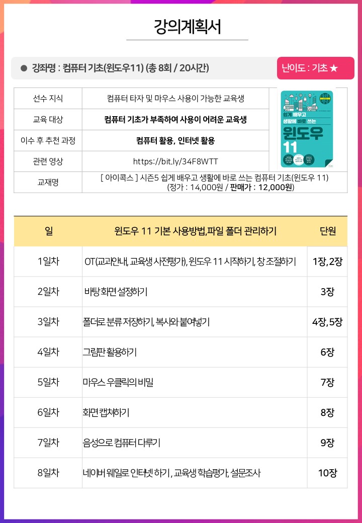 | 컴퓨터 기초(윈도우 11) 신청자:22/24명 , 대기자:0/12명 | |||