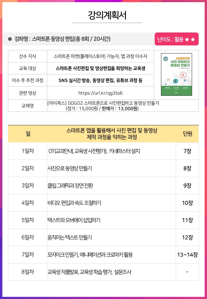 | 스마트폰 동영상 편집 신청자:30/30명 , 대기자:13/15명 | |||