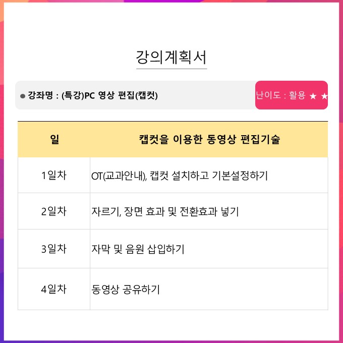 | (특강) PC 영상 편집(캡컷) 신청자:30/30명 , 대기자:15/15명 | |||