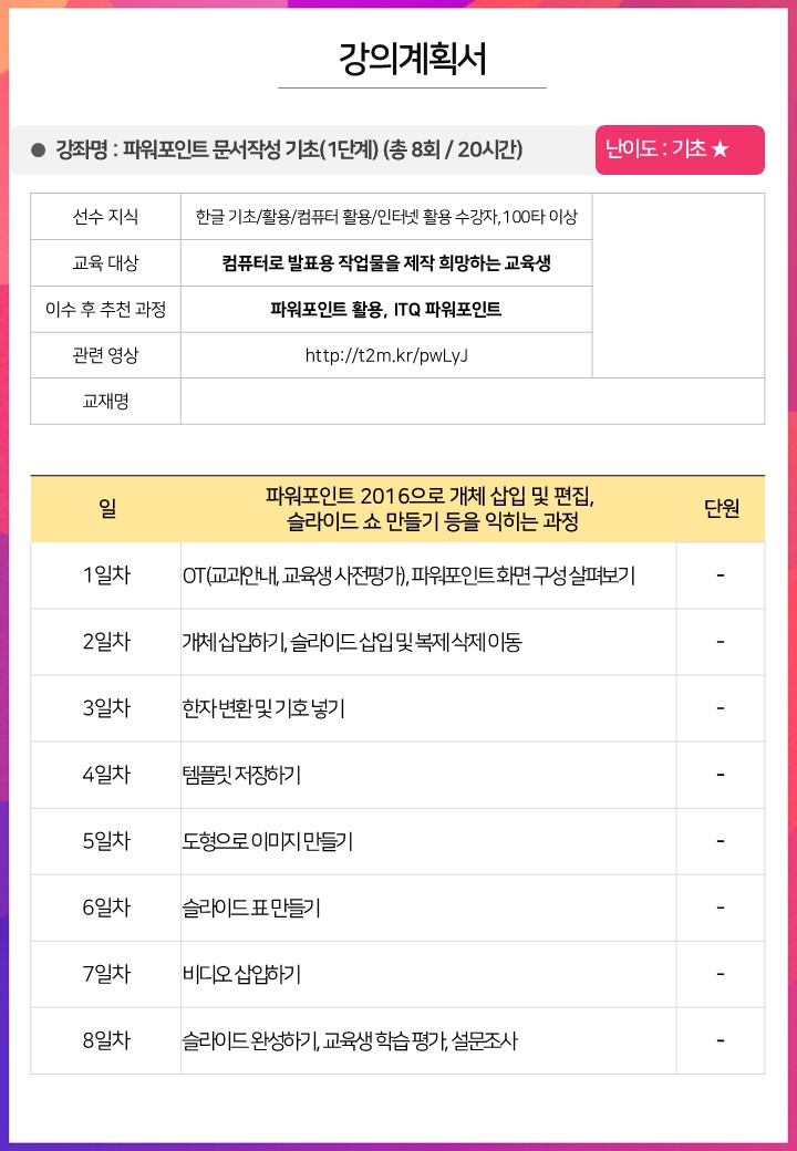 | 파워포인트 문서작성 기초(1단계) 신청자:30/30명 , 대기자:0/15명 | |||