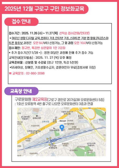 구로문화원 제2교육장(5층) 08272 서울특별시 구로구 경인로20가길 38 오류문화센터 5층 제2정보화교육장 |