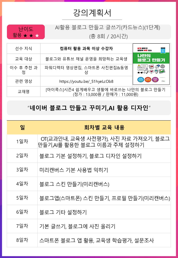 | AI활용 블로그 만들고 글쓰기(카드뉴스)(1단계) 신청자:24/24명 , 대기자:6/12명 | |||