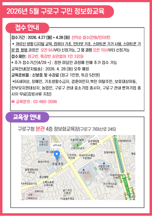 구로구청 교육장(4층) 08284 서울특별시 구로구 가마산로 245 4층 정보화교육장 |