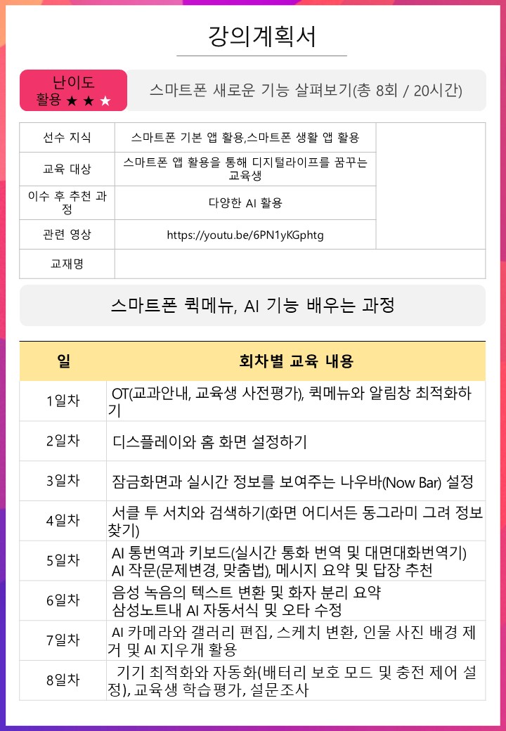 | 스마트폰 새로운 기능 살펴보기 신청자:16/24명 , 대기자:0/12명 | |||