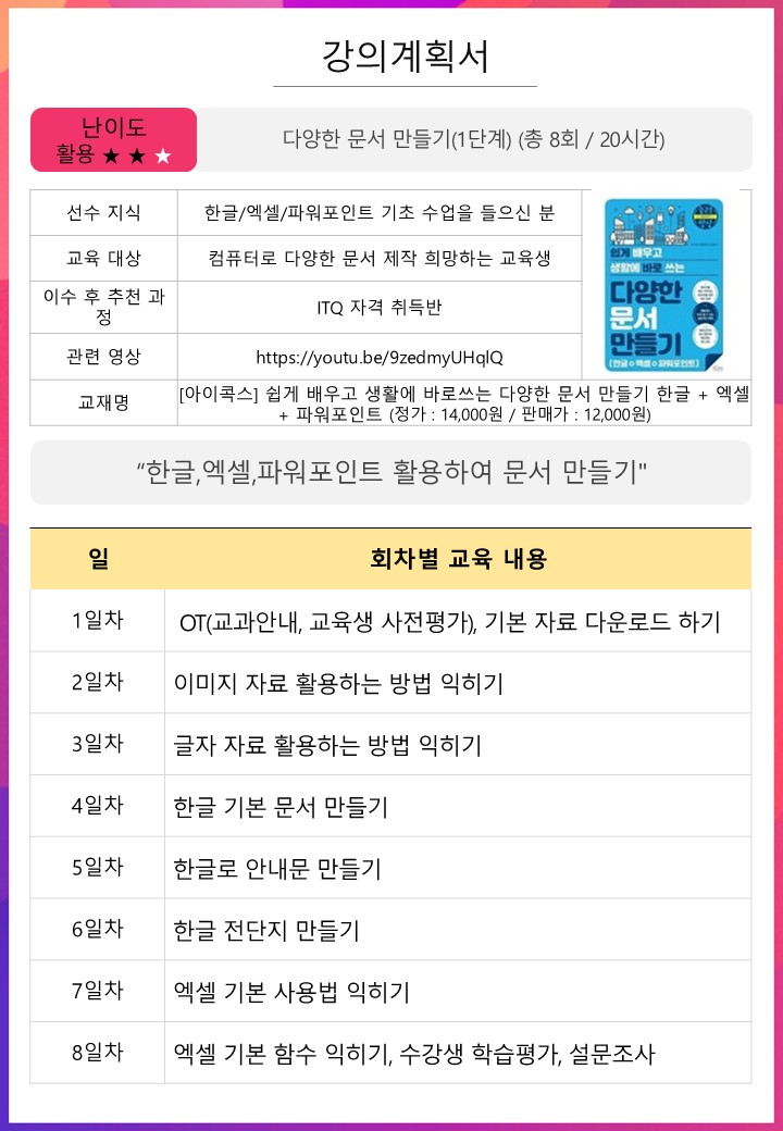 | 다양한 문서 만들기(1단계) 신청자:21/24명 , 대기자:0/12명 | |||