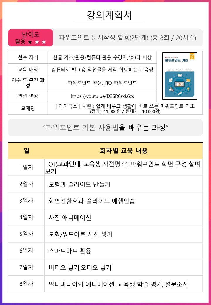 | 파워포인트 문서작성 활용(2단계) 신청자:13/20명 , 대기자:0/10명 | |||