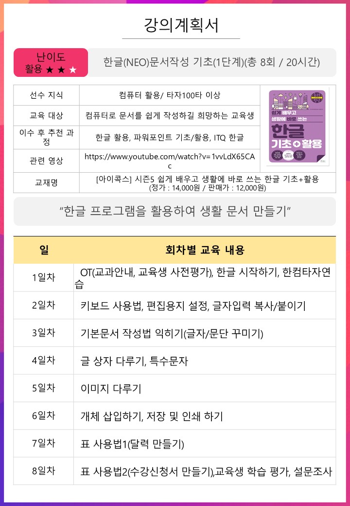 | 한글(NEO) 문서작성 기초(1단계) 신청자:21/24명 , 대기자:0/12명 | |||