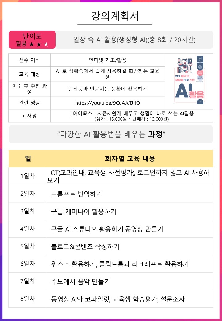 | 일상 속 AI 활용(생성형 AI) 신청자:30/30명 , 대기자:13/15명 | |||