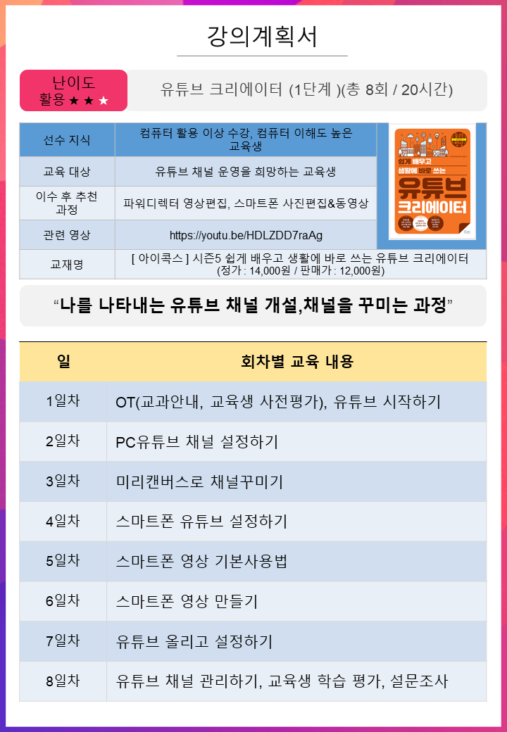 | 강좌영역 | 컴퓨터/모바일 | 강좌상태 | 모집중 교육대기 |