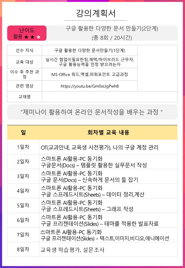 | 구글 활용한 다양한 문서 만들기(2단계)(독스,시트,슬라이드,AI 포함) 신청자:30/30명 , 대기자:9/15명 | |||