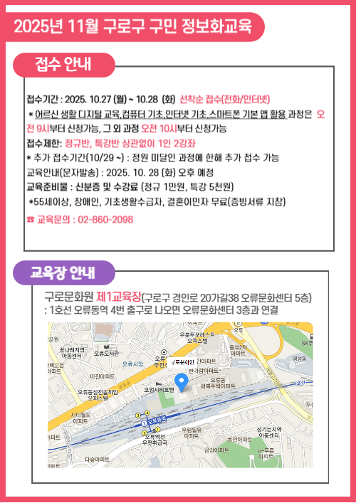 구로문화원 제1교육장(5층) 08272 서울특별시 구로구 경인로20가길 38 오류문화센터 5층 제1정보화교육장 |