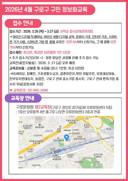 구로문화원 제2교육장(5층) 08272 서울특별시 구로구 경인로20가길 38 오류문화센터 5층 제2정보화교육장 |