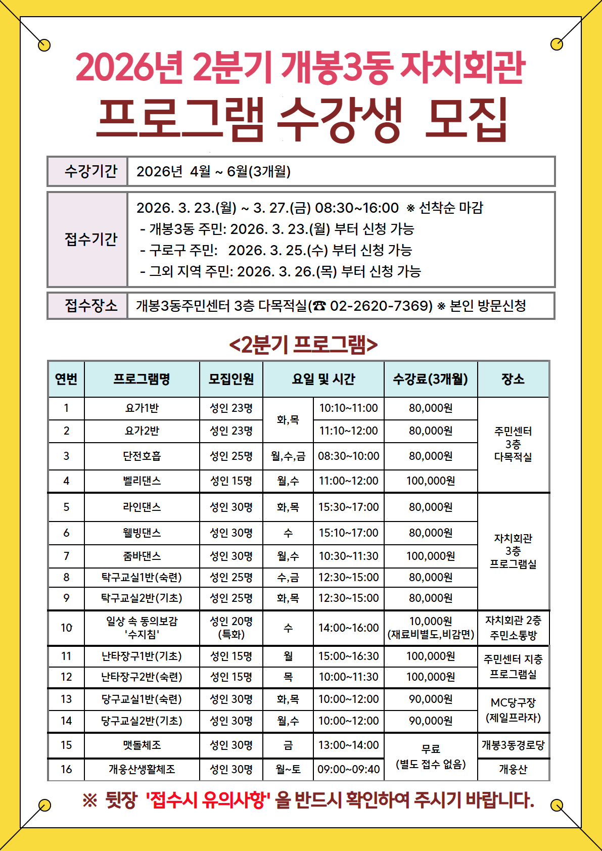 2026년 2분기 개봉3동 자치회관 프로그램 수강생을 아래와 같이 모집합니다.