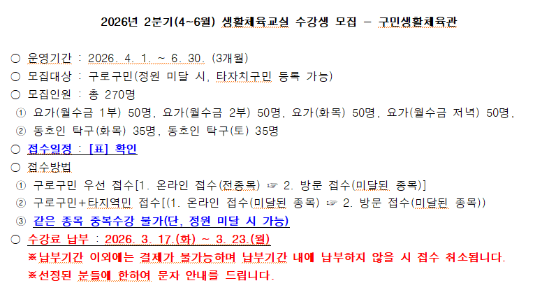 | 프로그램명 | [마감] ★구로구민 한정★[구민생활체육관 요가, 동호인 탁구] 2026년 2분기(4~6월) 생활체육교실 수강생 온라인 접수 |