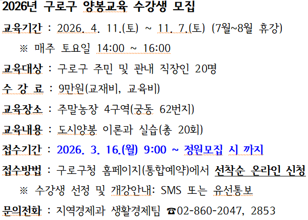 온라인접수 홈 구정참여 예약/접수 온라인접수 인쇄 공유하기 공유하기 페이스북 X 블로그 닫기 주의사항 현재 접수 대기중인 예약입니다. 온라인모집 상세보기 - 기관명, 프로그램명, 모집인원, 모집인원구분, 참석자정보수집여부, 참석자정보수집최대치, 프로그램내용 기관명 스마트도시과 프로그램명 2026년 구로구 양봉교육 수강생 모집 접수기간 2026.03.16 09시 ~ 2026.03.20 17시 프로그램내용 목록