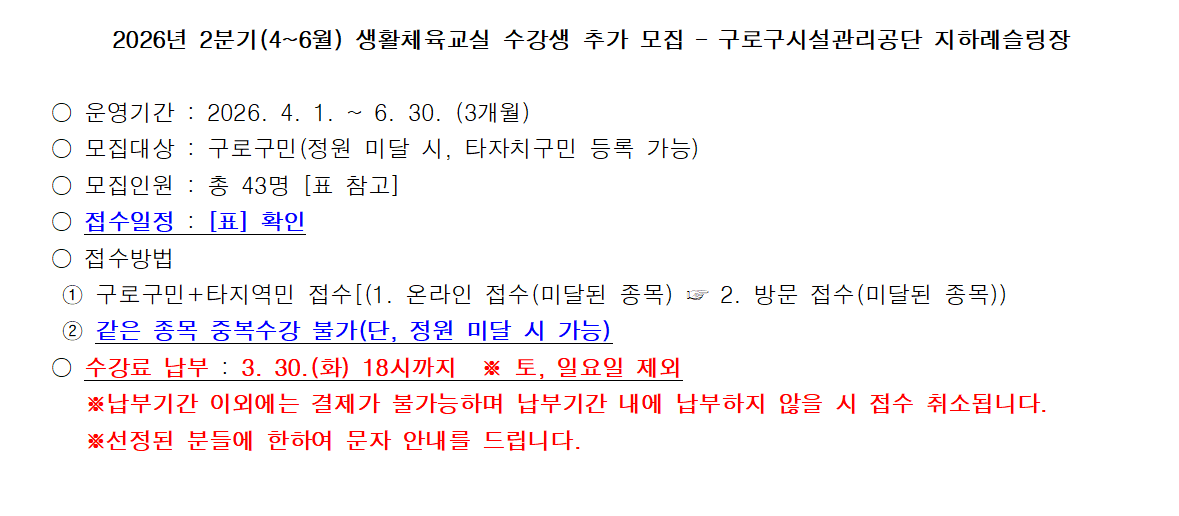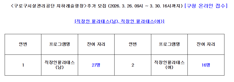 온라인접수 홈 구정참여 예약/접수 온라인접수 인쇄 공유하기 공유하기 페이스북 X 블로그 닫기 주의사항 현재 접수중인 예약입니다. 온라인모집 상세보기 - 기관명, 프로그램명, 모집인원, 모집인원구분, 참석자정보수집여부, 참석자정보수집최대치, 프로그램내용 기관명 구로구청 체육진흥과 프로그램명 [구로구시설관리공단 지하레슬링장] 2026년 2분기(4~6월) 생활체육교실 수강생 추가 모집 [직장인 필라테스] 접수기간 2026.03.26 09시 ~ 2026.03.30 16시 프로그램내용 문의사항) 구로구청 체육진흥과 생활체육팀(☎ 02-860-3320) 목록 접수신청