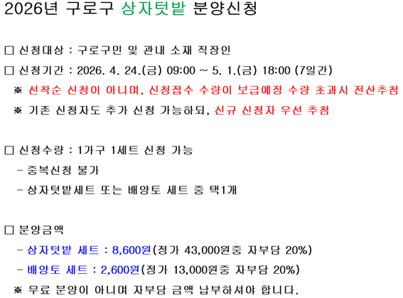 온라인접수 홈 구정참여 예약/접수 온라인접수 인쇄 공유하기 공유하기 페이스북 X 블로그 닫기 주의사항 현재 접수중인 예약입니다. 온라인모집 상세보기 - 기관명, 프로그램명, 모집인원, 모집인원구분, 참석자정보수집여부, 참석자정보수집최대치, 프로그램내용 기관명 지역경제과 프로그램명 2026년 구로구 상자텃밭 추가 분양 신청 접수기간 2026.04.24 09시 ~ 2026.05.01 17시 프로그램내용 목록 접수신청